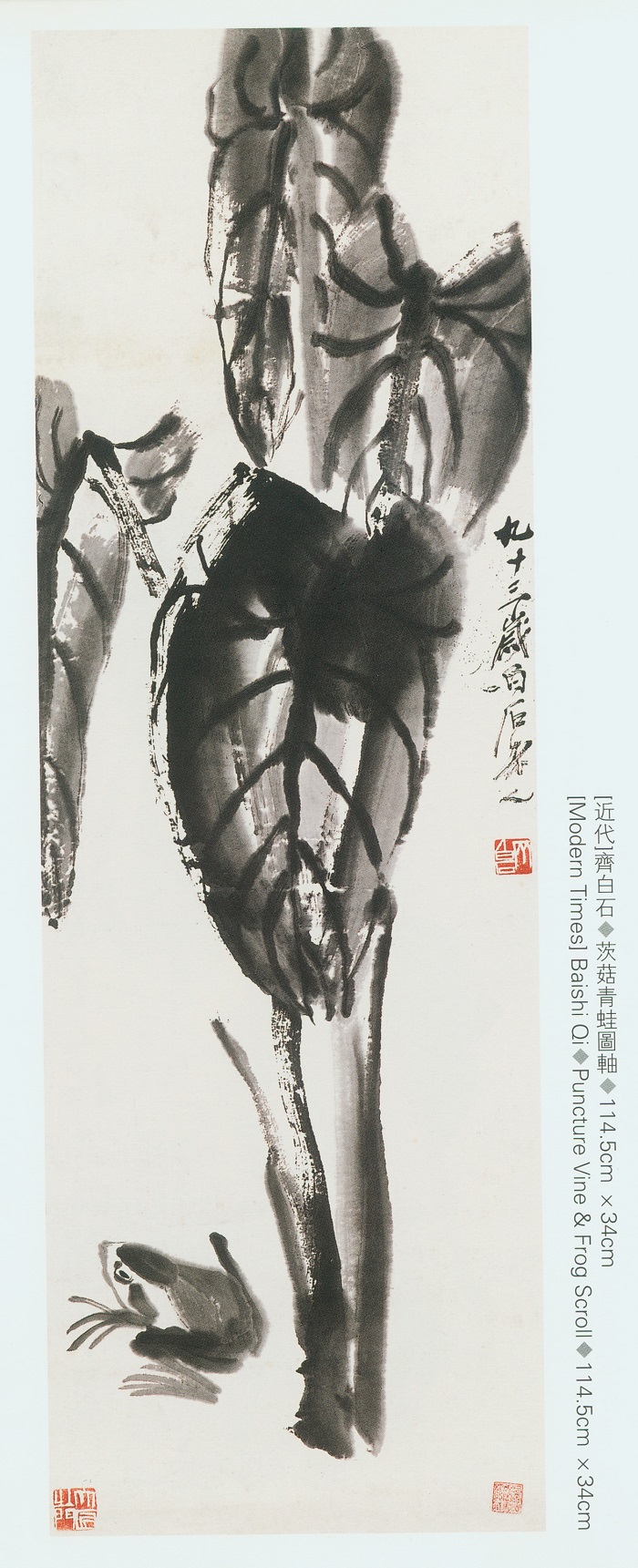齐白石(1864─1957),原名纯芝,号渭青、兰亭,后改名璜,号濒生,别号白石、白石老人,别署杏子坞老民、星塘老屋后人、借山吟馆主者、寄萍、齐大、木居士、湘上老农、三百石印富翁等。湖南湘潭人。他是在各方面造诣都很高的现代绘画大师,继清末民初海派画家之后,他把传统中国画推到了一个新的高峰。他的人品、绘画、诗句、书法、篆刻,无不出类拔翠。他的风格对现代乃至当代中国画创作产生了极为巨大的影响。